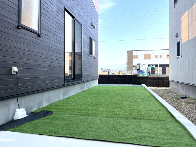 リビング横の広々としたスペースには人工芝を。 今回は、sotoeが最も重要な「下地作り」を担当し、仕上げの人工芝敷設はお客様ご自身で行っていただくという、コラボレーション形式での施工となりました。平らで水はけの良い下地はプロがしっかりと作り込み、仕上げをお客様の手で行うことで、コストを抑えつつお住まいへの愛着もより一層深まります。